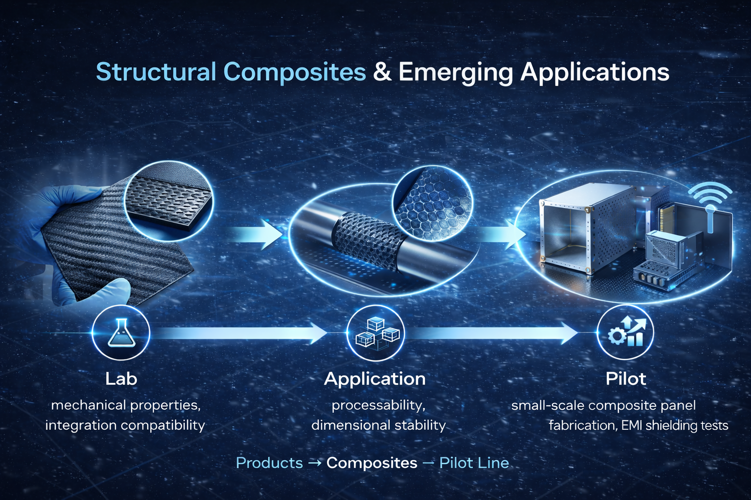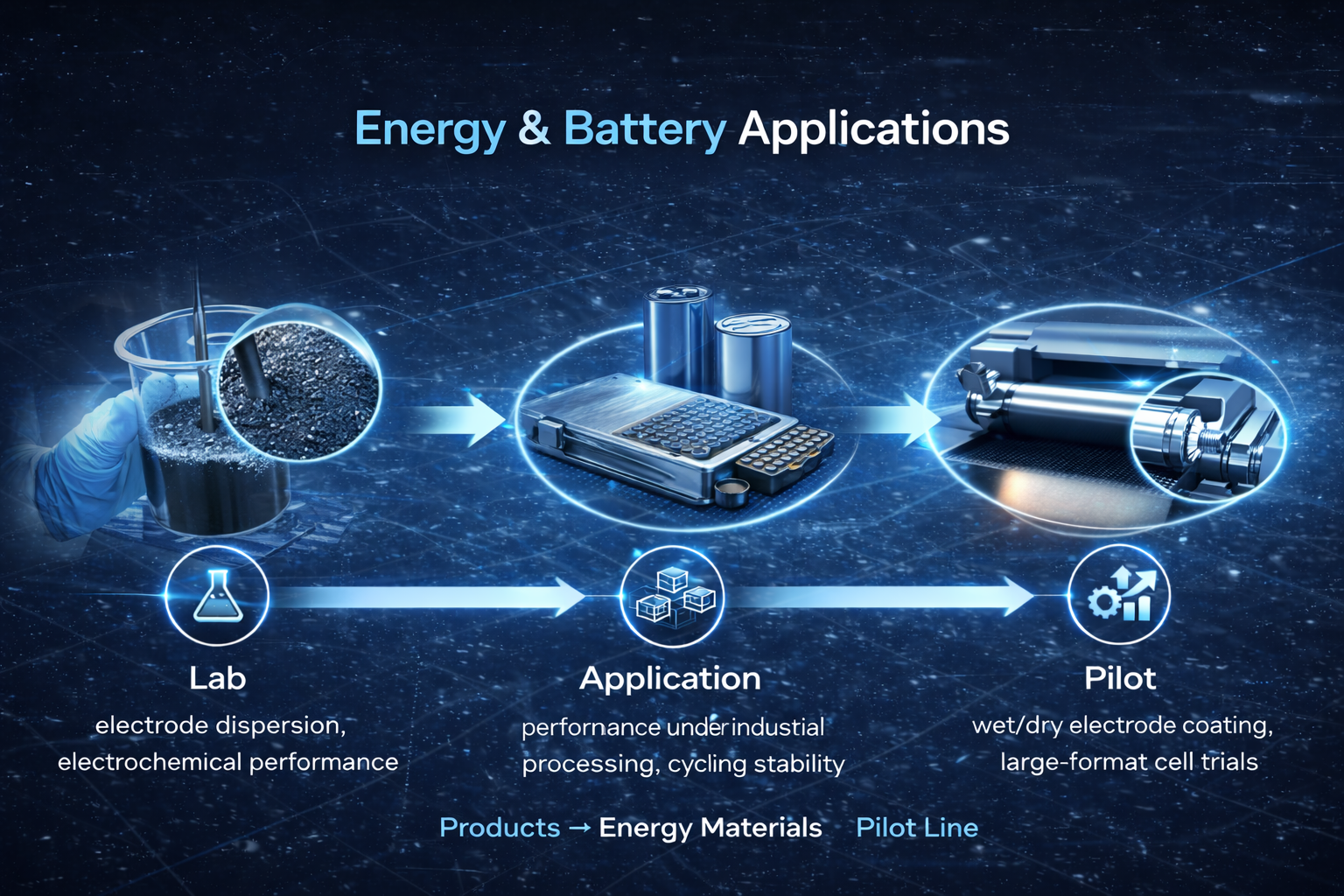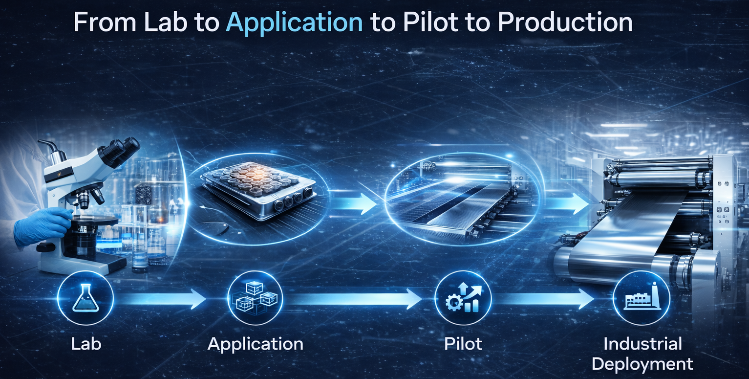 This page illustrates the complete pathway: **Lab → Application → Pilot → Industrial Deployment**, helping you understand where each material excels and how it can be reliably scaled.