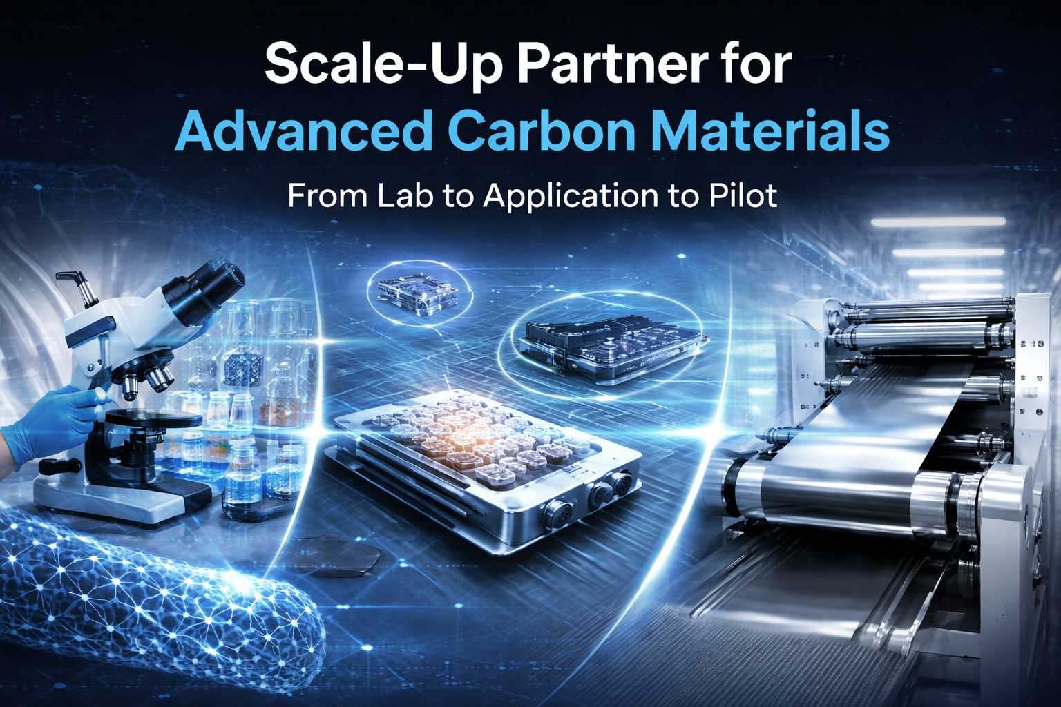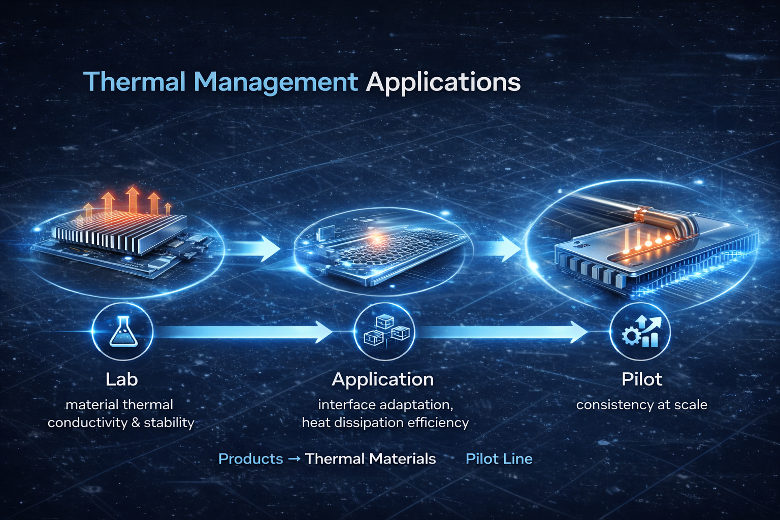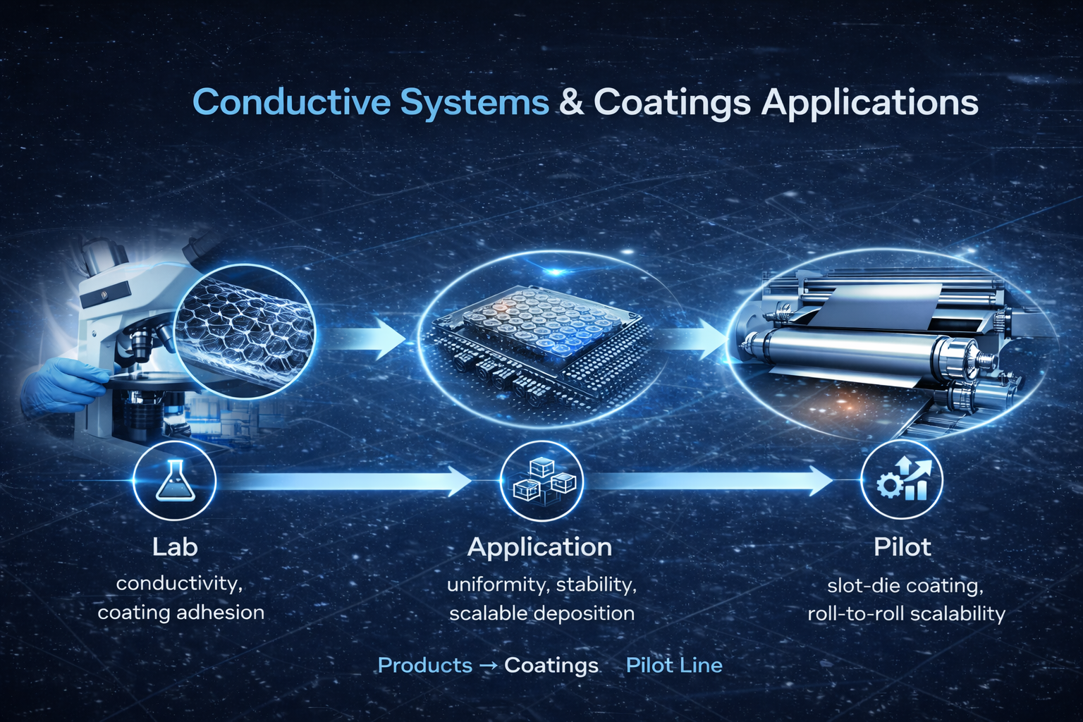 This page illustrates the complete pathway: **Lab → Application → Pilot → Industrial Deployment**, helping you understand where each material excels and how it can be reliably scaled.